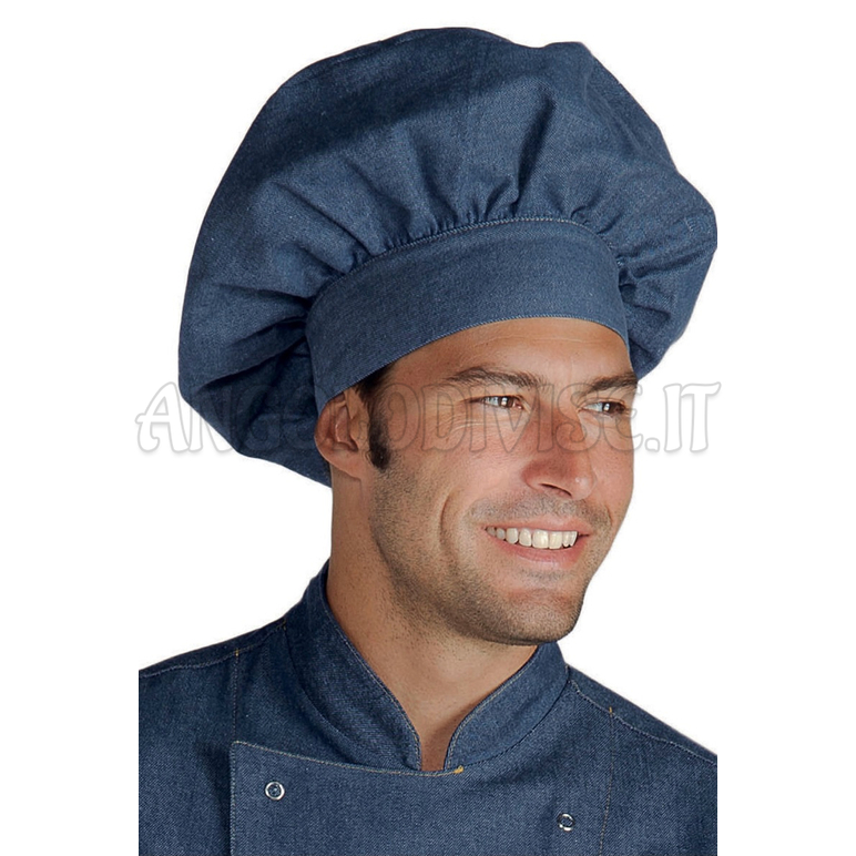 ISACCO CAPPELLO CUOCO JEANS 100 % COTTON. Classica divisa da cuoco e chef, da lavoro in cucina o per cerimonie. Regolabile con velcro. Professione: Aiuto cuoco, Cuoco, Lavapiatti, Pizzaiolo.