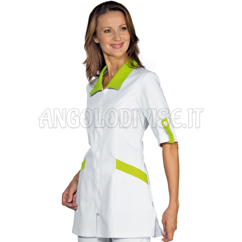 ISACCO CASACCA TORTOLA BIANCO+ MELA 65% POLYESTER 35% COTTON A MEZZA MANICA. Utilizzata nel settore estetico e sanitario. Ottima divisa da lavoro per estetiste, massaggiatrici e negozi alimentari. L'indumento è sciancrato e presenta una zip. Professione: Estetista, Gastronomo, Gelataio, Maestra d'asilo, Panettiere, Parrucchiera, Pasticcere, Onicotecnica.